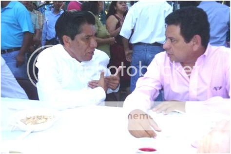 Mario Moreno Arcos, candidato a la presidencia municipal de Chilpancingo y Tulio Samuel Pérez Calvo, edil capitalino captados hoy en una amena conversación después de saborear un pozole, en el barrio de San Antonio.