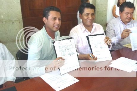 El alcalde de esta ciudad capital, de extracción priísta, Mario Moreno Arcos presidente priísta de esta capital así como el director de la Congregación «Mariana Trinitaria», acompañados de varios presidentes municipales de las regiones Centro y Montaña, a las 13:24 horas del día de hoy firmaron un convenio de colaboración, destacándose la participación de, Ignacio Basilio García, edil y de su homólogo, Francisco Javier García González, llevándose acabo en el Salón de Usos Múltiples de Palacio municipal. (Foto: Domingo Francisco Reyes).