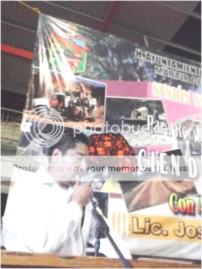 El alcalde perredista de Mártir de Cuilapan (Apango) José Guadalupe Rivera Ocampo rindió anoche de este domingo ante su pueblo el informe de sus primeros Cien Días de Gobierno, en su segunda sesión de Cabildo celebrada en la cancha central. (Foto: Agustín Nava Escobar).